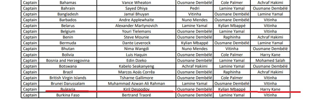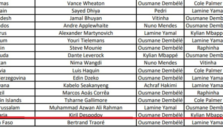 Капитанът на националния ни отбор по футбол Кирил Десподов позна, че Усман Дембеле ще спечели голямата награда за "The Best" на ФИФА. Трофеят за №1 при мъжете отиде при нападателя на ПСЖ и Франция Усман Дембеле. Десподов е поставил именно него на първо място, а в неговата класация за топ 3 са още Килиан Мбапе (Реал/Франция) и Хари Кейн (Байерн/Англия).