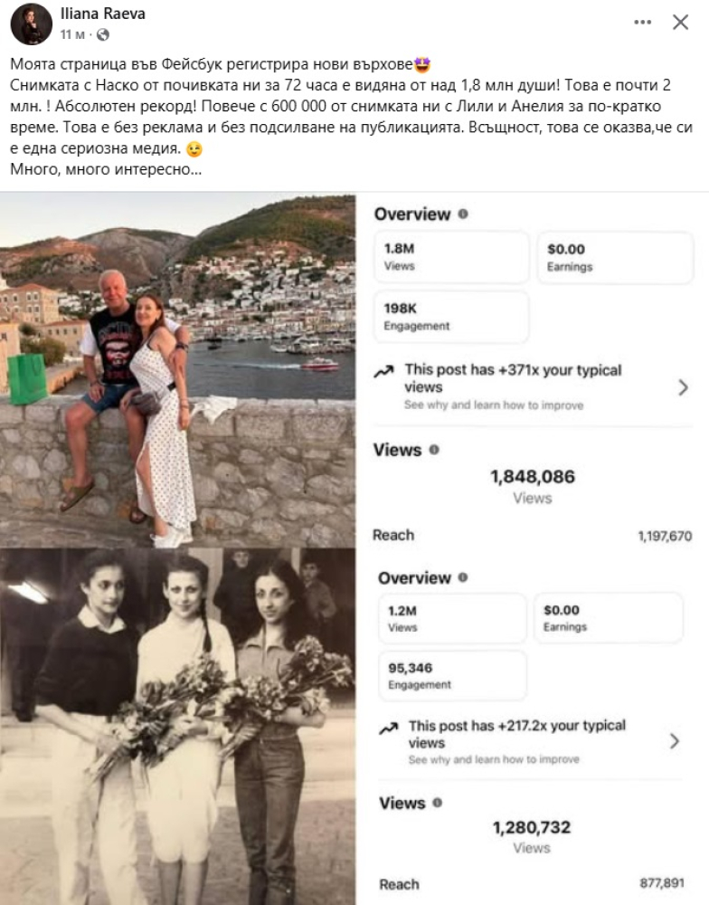 "Моята страница във "Фейсбук" регистрира нови върхове. Снимката с Наско от почивката ни за 72 часа е видяна от над 1,8 млн. души! Това е почти 2 млн.! Абсолютен рекорд! Повече с 600 000 от снимката ни с Лили и Анелия за по-кратко време. Това е без реклама и без подсилване на публикацията. Всъщност, това се оказва, че си е една сериозна медия.?? Много, много интересно…", написа Раева.