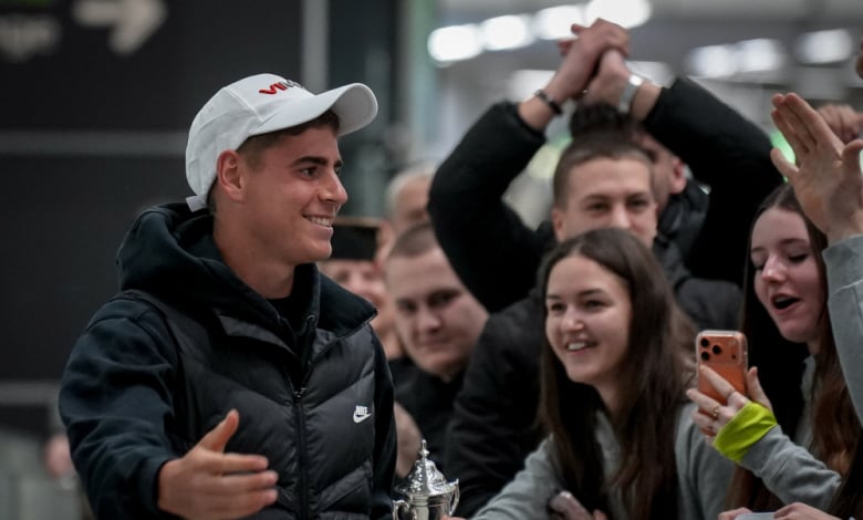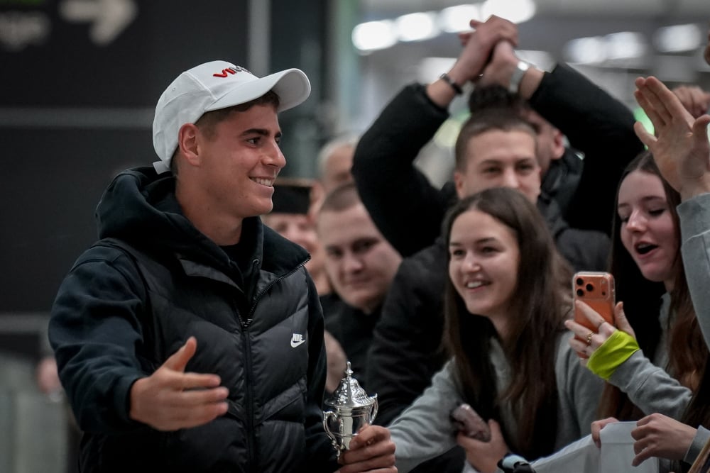 приятели, които го приветстваха с възгласи „Шампионе!".