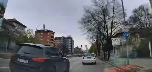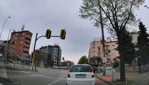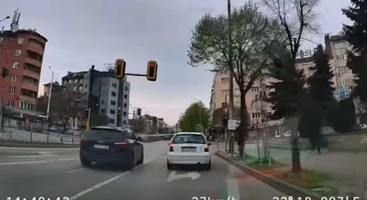 Водачът опитва да се престрои в дясната лента, но не завършва маневрата. Когато стига до светофара на кръстовището, сигналът се променя на червен — забранителен за преминаване.