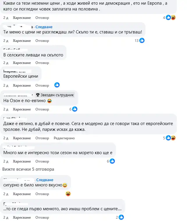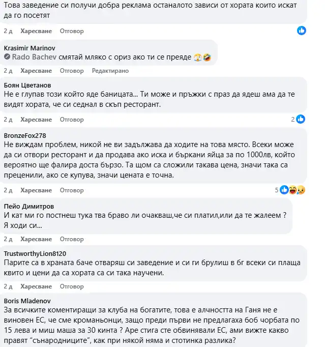 Постът предизвика разгорещени коментари в социалната мрежа. Според някои потребители собственикът има пълно право да определя сам цените си. Според други обаче цените със сигурност не са нормални дори за заведение.