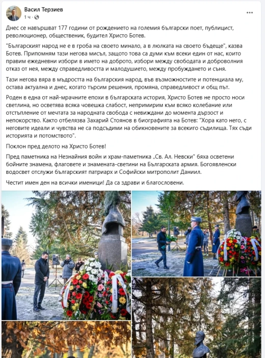 Днес се навършват 177 години от рождението на големия български поет, публицист, революционер, общественик, будител Христо Ботев. Така започва поста във фейсбук профила на градоначалника на София Васил Терзиев.
