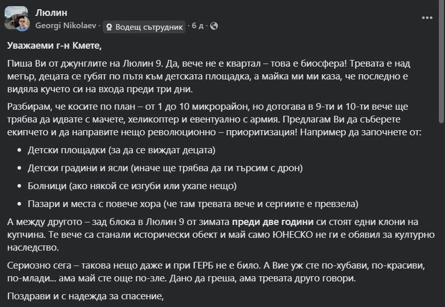 Г-н кмете, ние сме от Люлин – можем да изтърпим много. Но между тревата, клоните, тъмнината и пълната липса на контрол, започваме да се чудим дали не сме участници в социален експеримент. Искаме кварталът ни да прилича на място за живеене, а не на тренировъчен лагер за оцеляване в дивото. И не, не сме "вечно недоволни".