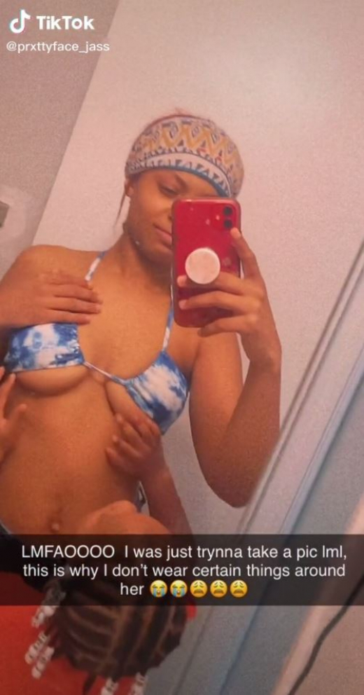 На кадрите може да се види как блогърката с никнейм @prxttyface_jass се е снимала в огледалото, облечена в синьо-бял бански. Докато записвала видеото, дъщеря ѝ се приближила до жената и я попитала защо гърдите ѝ се виждат.