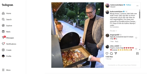Приготвихме това прасе за Доналд Тръмп-младши... P.S.: Би било глупаво да му предложим скариди и ципура“, написа Александър Вучич в профила си в Instagram.