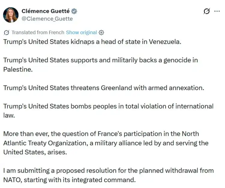 Заместник-председателят на Националното събрание (парламентът) на Франция, Клеманс Гете, внесе резолюция за подготовка за евентуално излизане на страната от НАТО