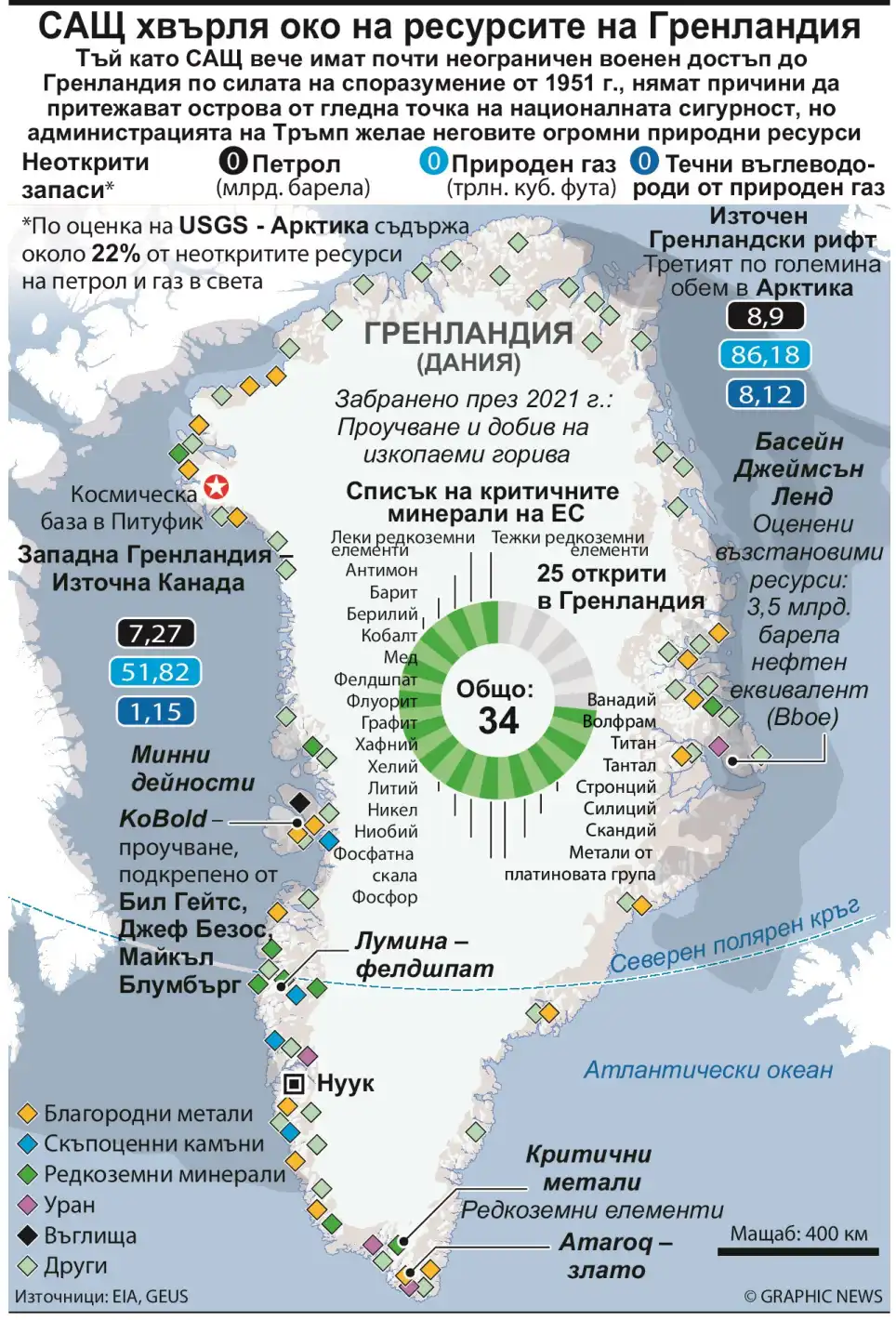 Според експерти поне 25 от 34-те минерала, определени от ЕС като критични, се срещат в Гренландия. Това превръща острова в ключова точка в глобалната надпревара за суровини – особено на фона на опитите на Запада да намали зависимостта си от доставки от Китай.