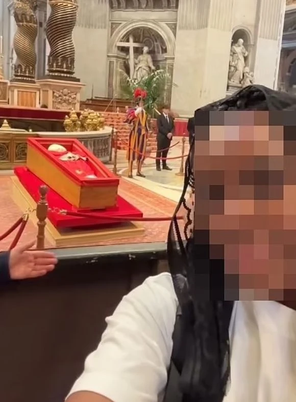 В Instagram едно изображение показва жена, усмихната в камерата, докато показва папата, стискащ броеницата си на около 3 метра зад нея. Тялото му, облечено в бяла митра и червена папска роба, символизиращи любовта и кръвта на Христос, може ясно да се види в ковчега, който лежи на повдигната платформа.