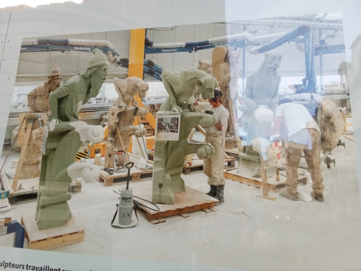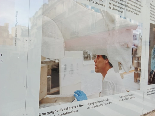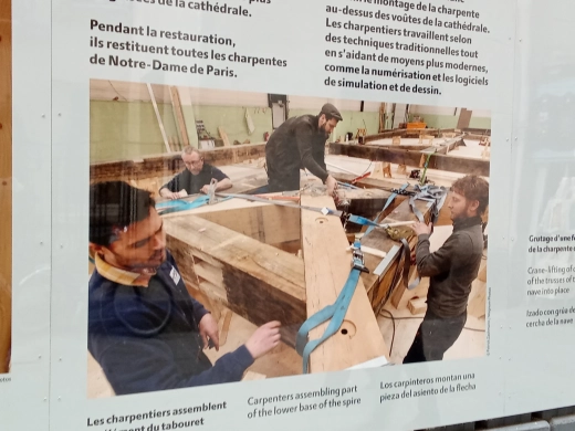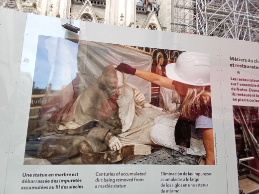„Нотр Дам“ бе открита отново за посещения на 7 декември, а рекламните пана около нея разказват с подробности за възстановяването на катедралата след пожара.