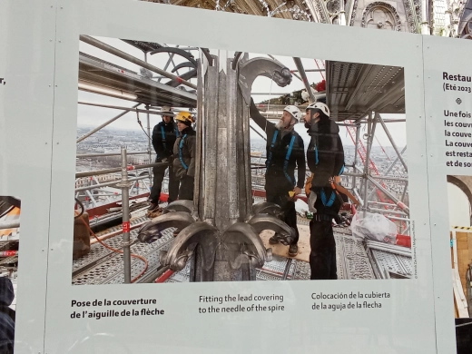 Катедралата бе подпалена на 15 април 2019 година, а причините за пожара така и не бяха установени. Във възстановяването са участвали хиляди дърводелци, каменоделци и художници на стъклописи, които са работили почти денонощно в продължение на пет години, пише върху паната.