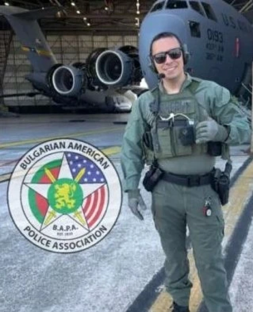 „Военновъздушната база в Чарлстън посрещна специален гост, вицепрезидента Джей Ди Ванс. Шерифът от БАПА Александър Балчев, който е от екипа за специални части на окръг Чарлстън, осигуряваше сигурността на вицепрезидента по време на посещението“, обявиха от организацията. На снимка се вижда БГ полицаят пред самолет C-17 Globemaster в базата.