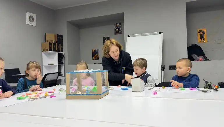 Изданието разказва как психологът Халина Лисенко се суети сред малка група деца, седнали на маса в мазе в Херсон. През 2024 г. собственият ѝ дом е повреден от руски обстрел, оставяйки я ранена в крака и стомаха.