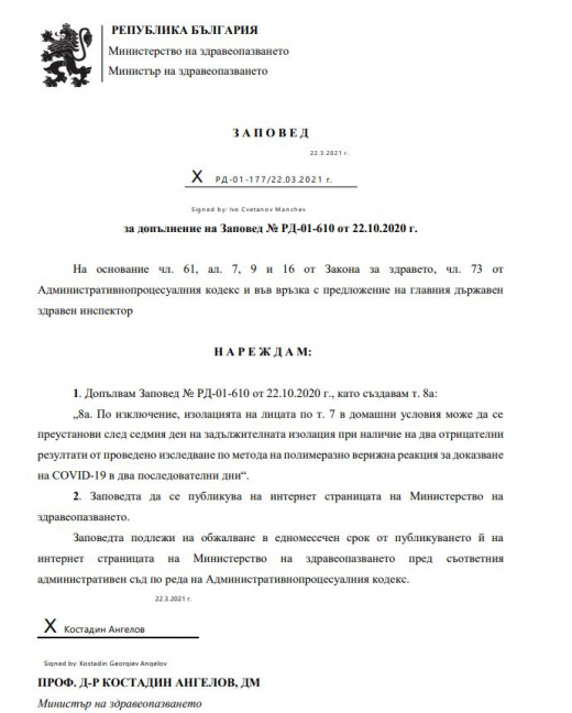 Министерство на здравеопазването излезе с нова заповед за освобождаването от карантина. В нея е допълнено, че изолацията на лицата по т. 7 в домашни условия може да се преустанови след седмия ден на задължителната изолация при наличие на два отрицателни резултати от проведено изследване по метода на полимеразно верижна реакция за доказване на COVID-19 в два последователни дни.